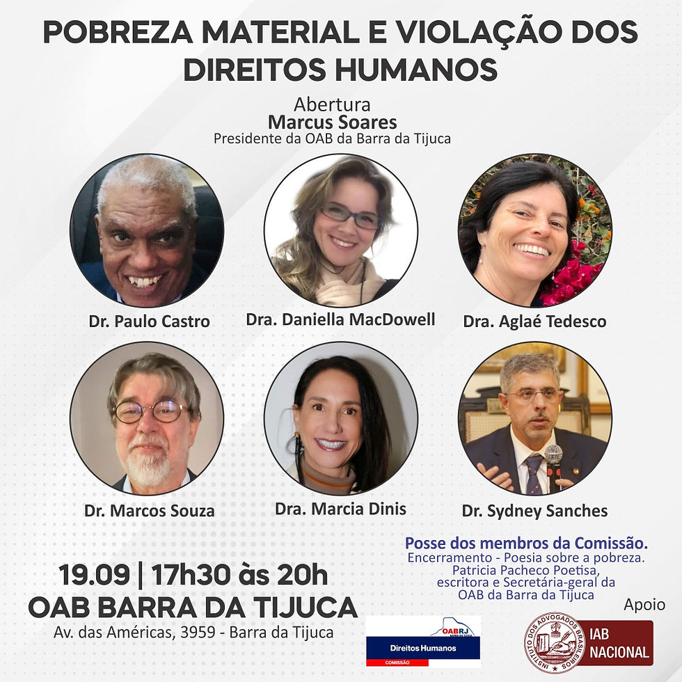Na próxima segunda-feira, 19 de setembro, às 17h30, ocorrerá o evento "Pobreza Material e Violação de Direitos Humanos" na OAB Barra da Tijuca.
